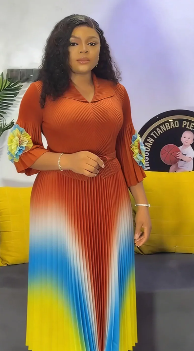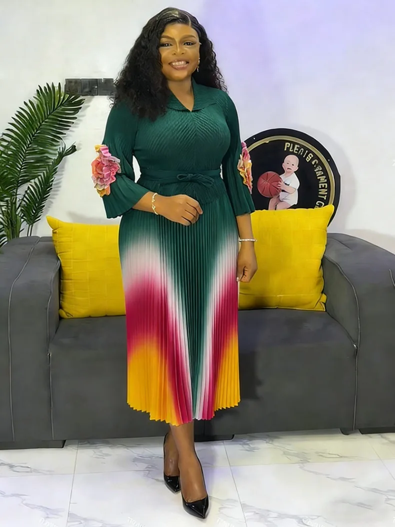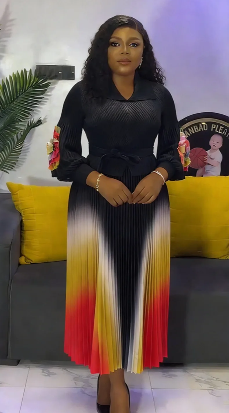 Gradient Pleated A-Line Dress - A women's elegant office lady dress featuring turn-down collar lapel, long lantern sleeves, belt waist, gradient pattern, high-temperature pleating technique, A-line silhouette, natural waistline, and premium quality construction perfect for all seasons and formal occasions.