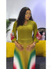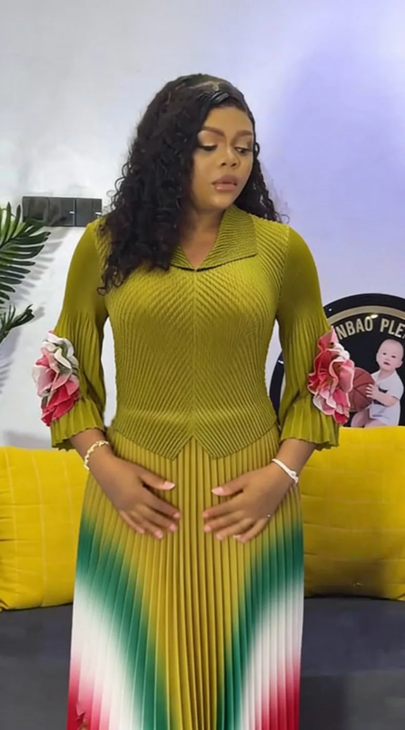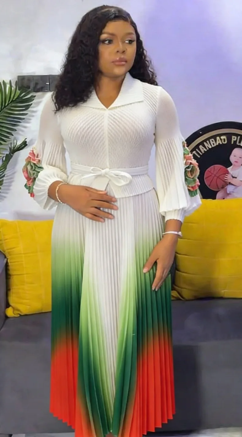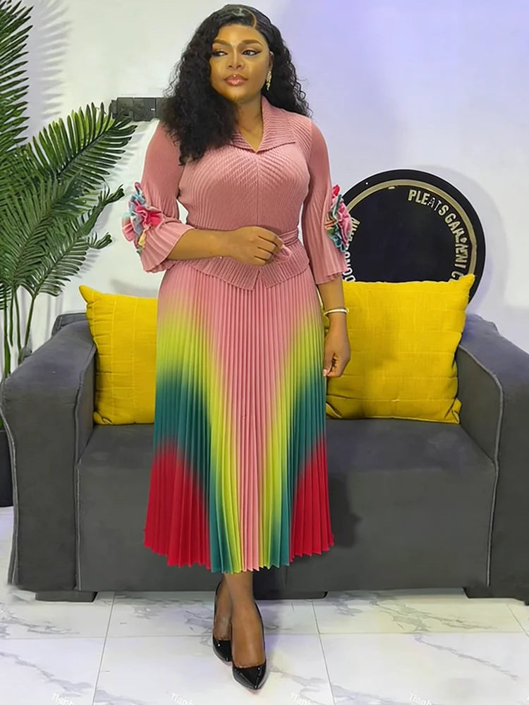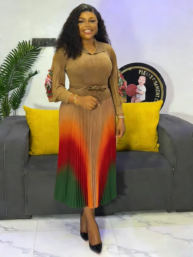 Gradient Pleated A-Line Dress - A women's elegant office lady dress featuring turn-down collar lapel, long lantern sleeves, belt waist, gradient pattern, high-temperature pleating technique, A-line silhouette, natural waistline, and premium quality construction perfect for all seasons and formal occasions.