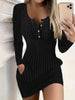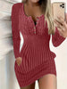Product Description (English): Long Sleeve Knitted Bodycon Dress - A women's autumn/winter office lady dress featuring O-neck, button details, ribbed knit texture, slim-fit sheath silhouette, solid color polyester fabric, and sexy mini length perfect for professional or casual wear.