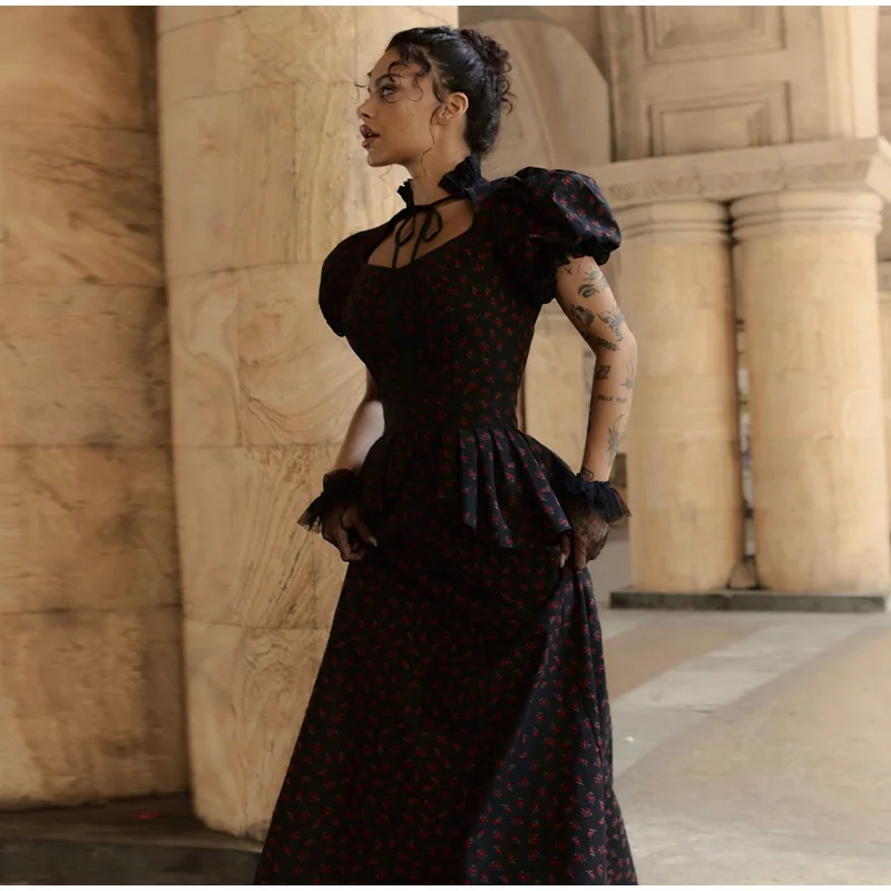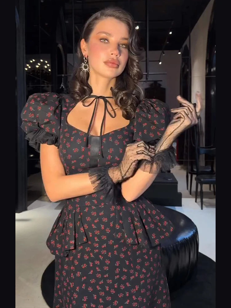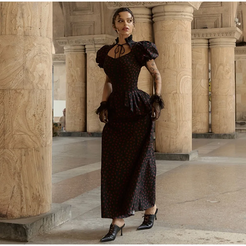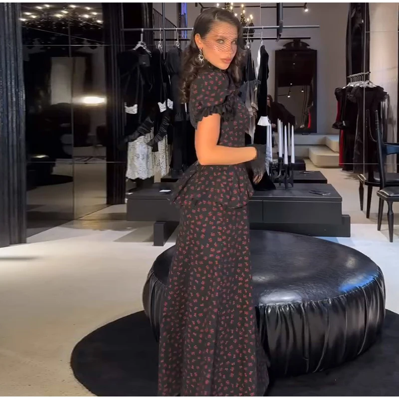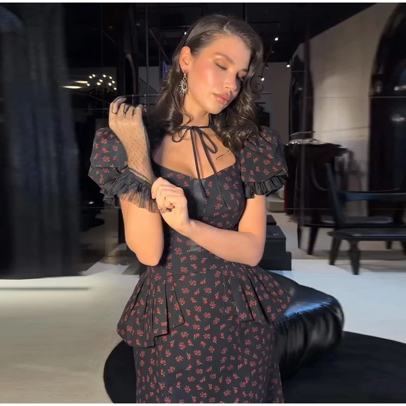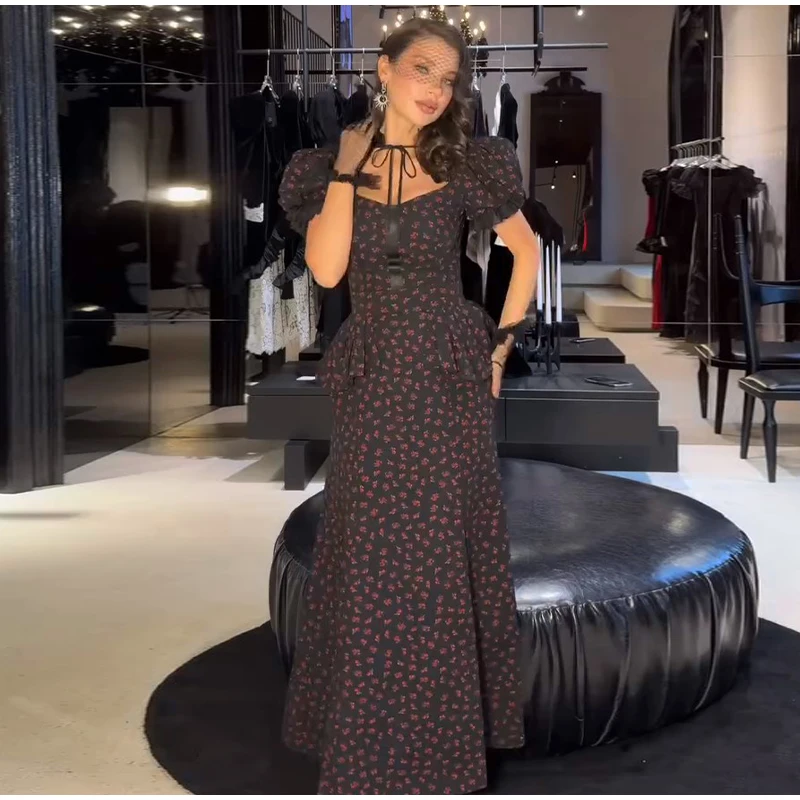 Floral Print Mermaid Dress - A women's spring long dress featuring square neck, short puff sleeves, ruffle detailing, mermaid silhouette, trendy floral print pattern, and fashionable robe styling perfect for 2026 spring season wear.