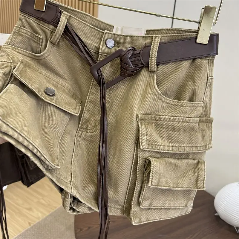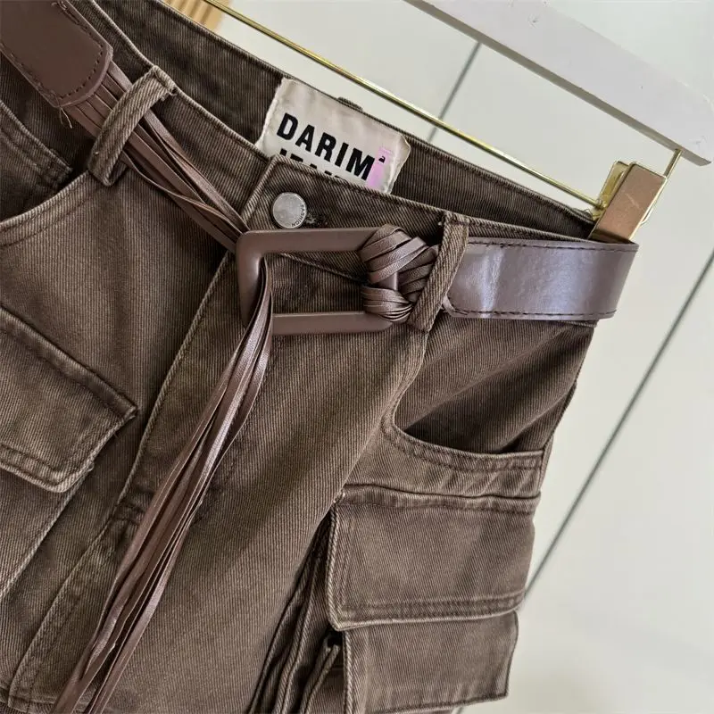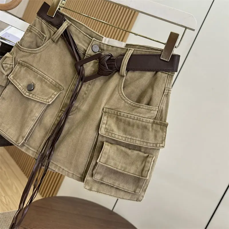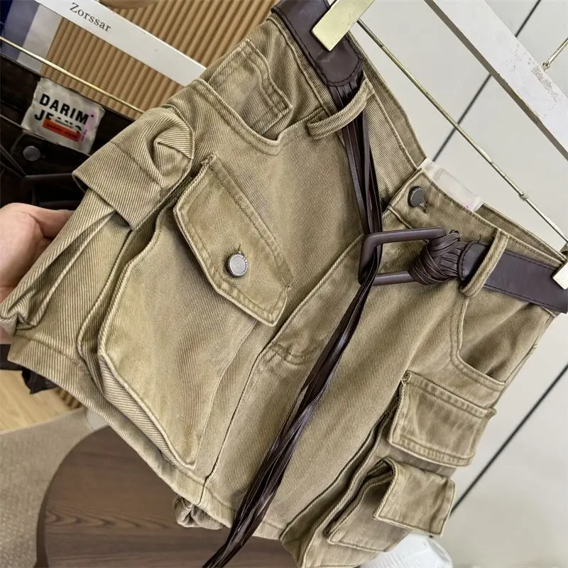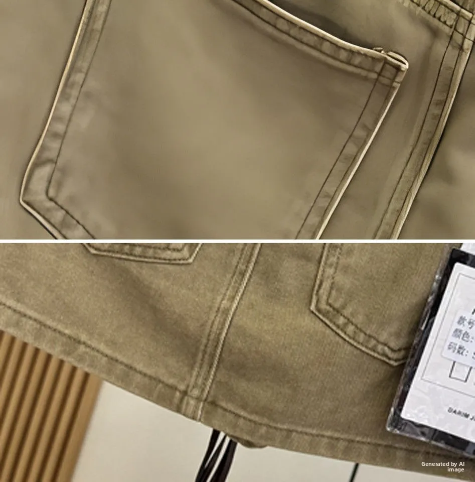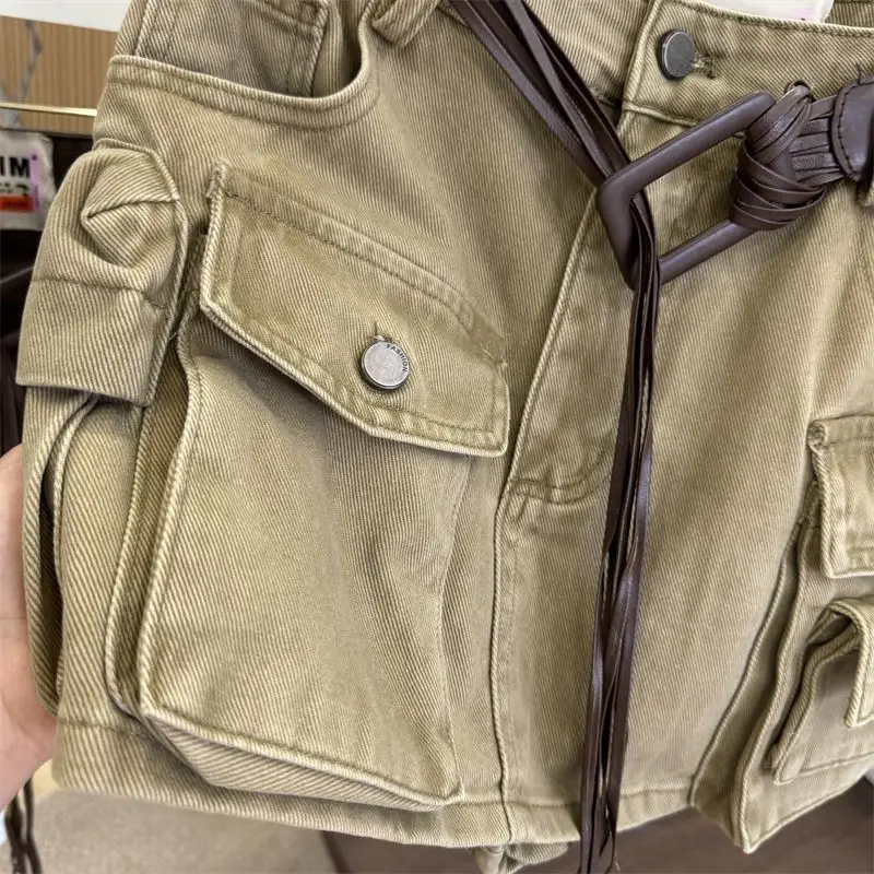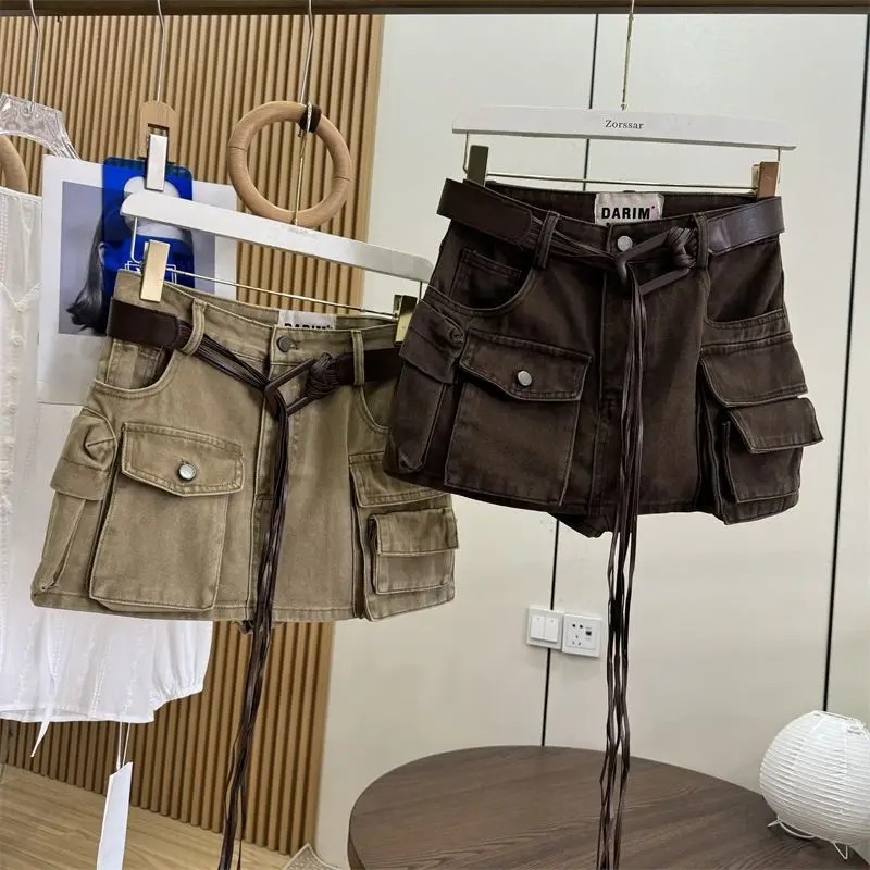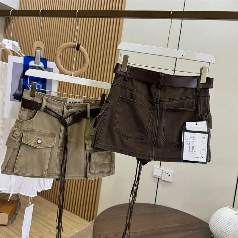 A loose retro streetwear cotton denim skirt featuring high waist, slimming design, short length, A-line silhouette, pure color pattern, Korean casual style, and loose fit. Perfect for early autumn with a sexy and fashionable statement.
