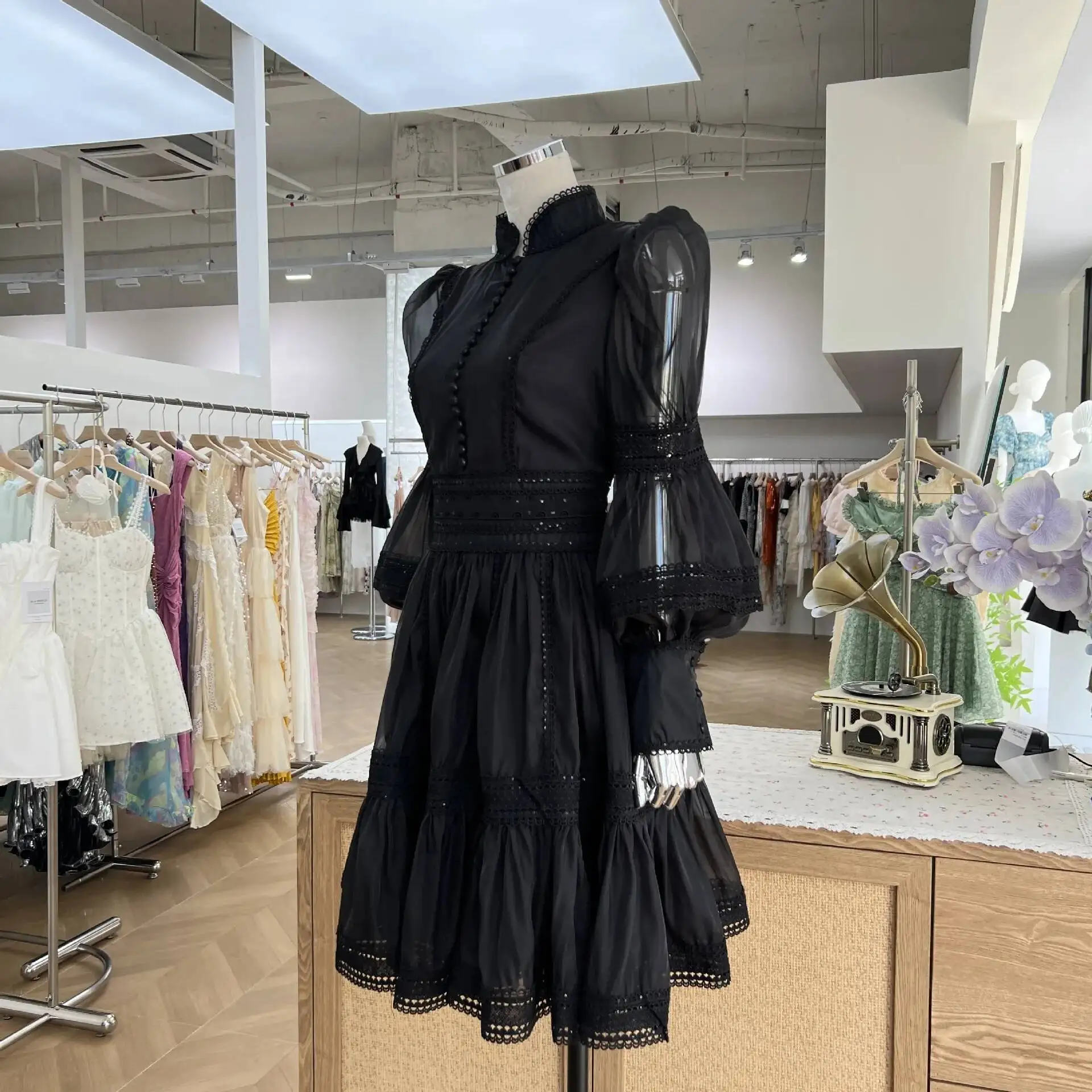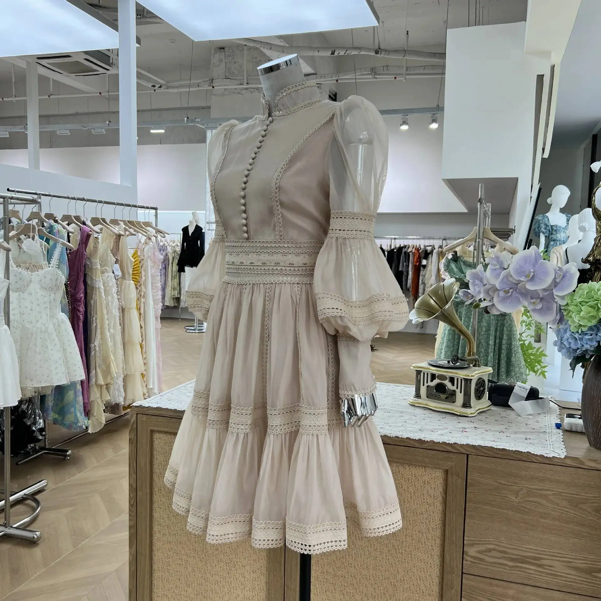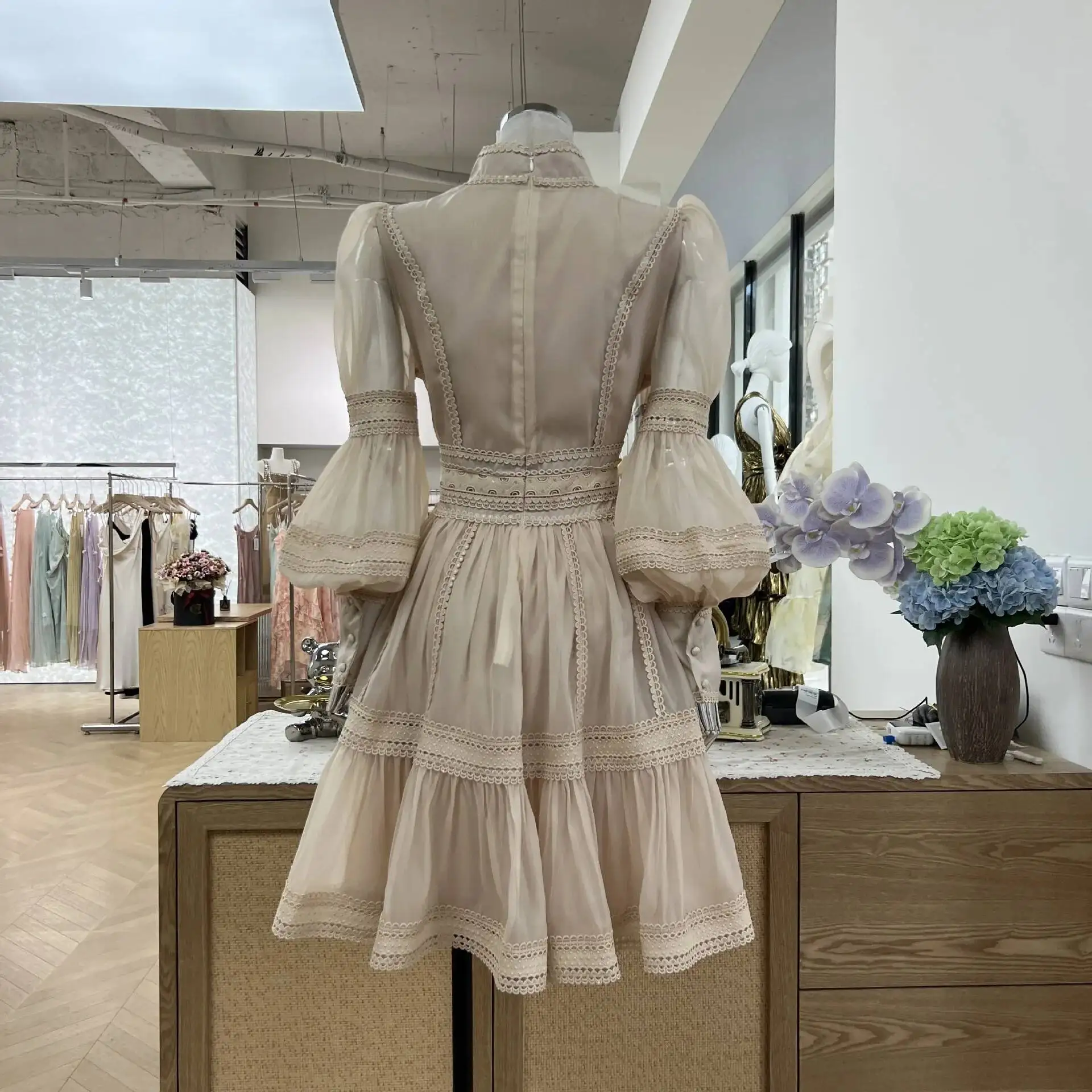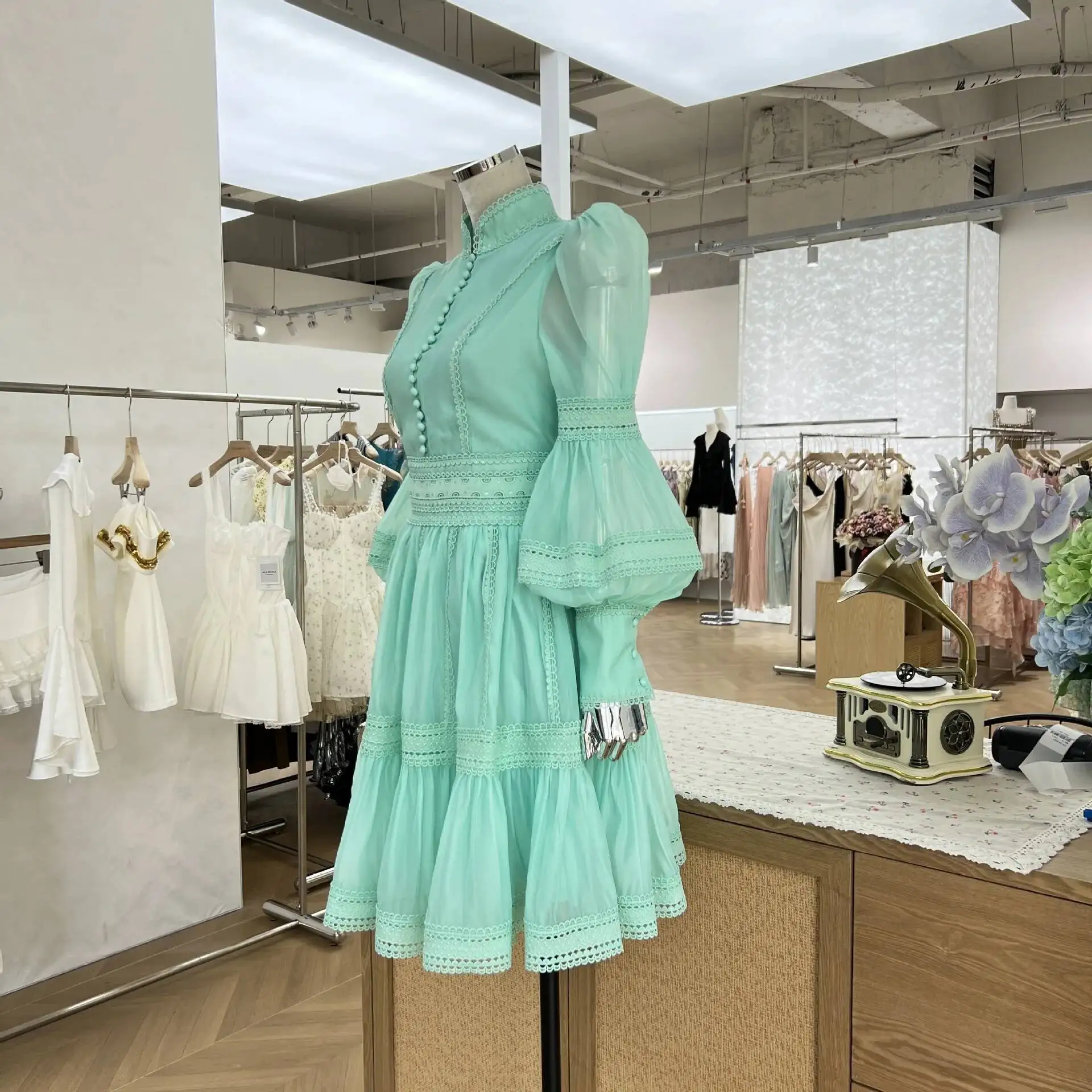 Luxury Organza Prom Dress - A women's elegant evening dress featuring stand collar, long lantern puff sleeves, zipper closure, empire waist, fit-and-flare silhouette, organza viscose fabric with slight stretch, solid color, and formal styling perfect for prom, parties, or sweet elegant occasions.