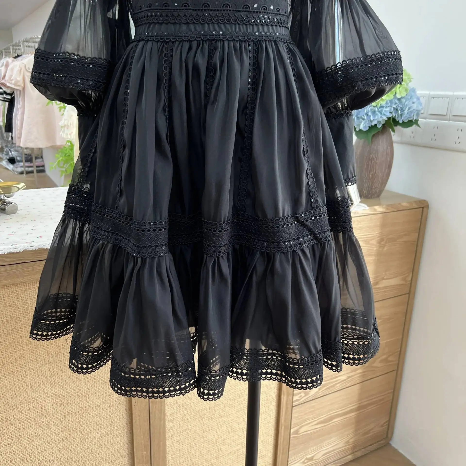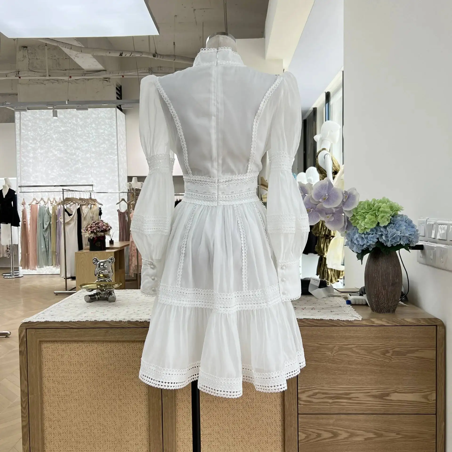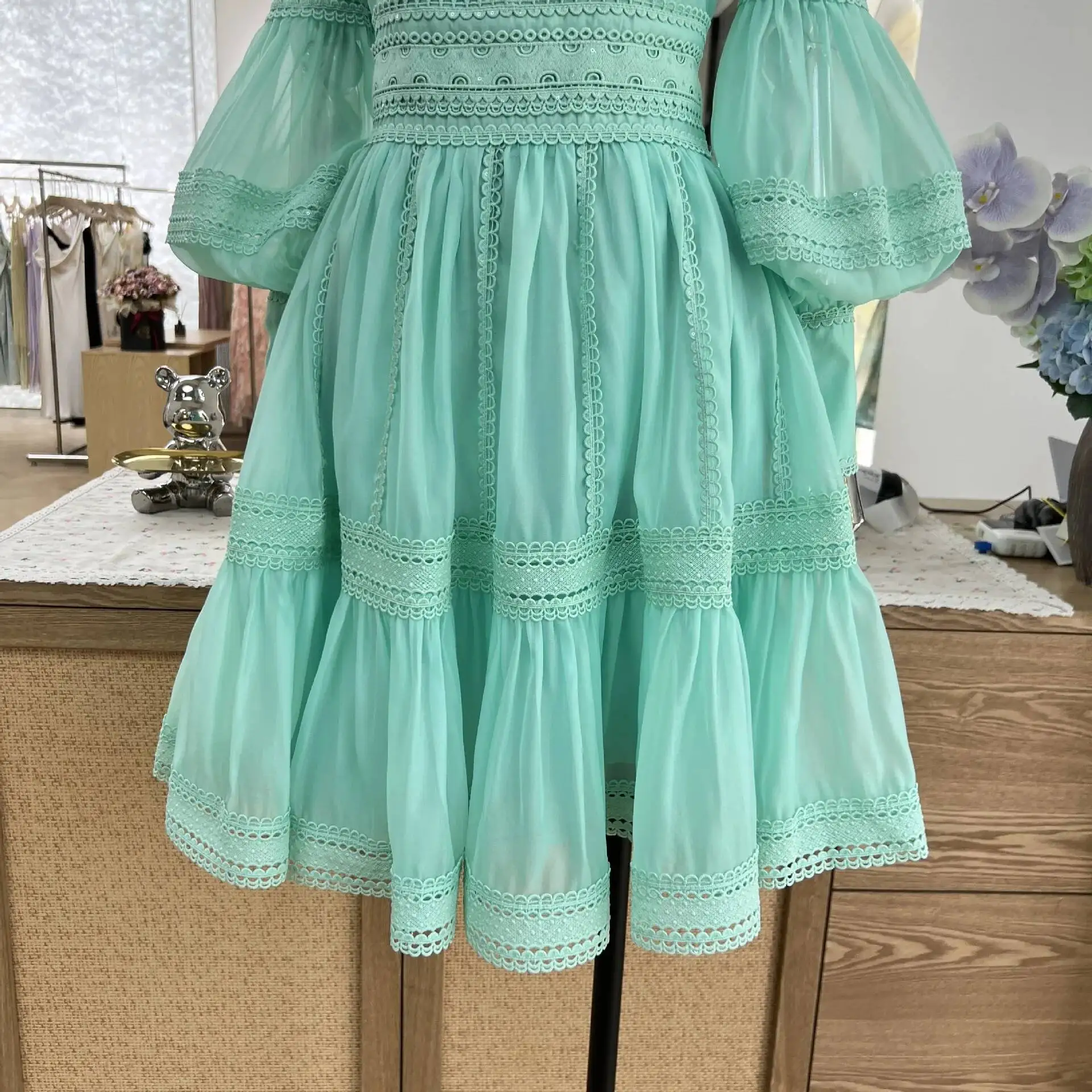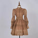 Luxury Organza Prom Dress - A women's elegant evening dress featuring stand collar, long lantern puff sleeves, zipper closure, empire waist, fit-and-flare silhouette, organza viscose fabric with slight stretch, solid color, and formal styling perfect for prom, parties, or sweet elegant occasions.