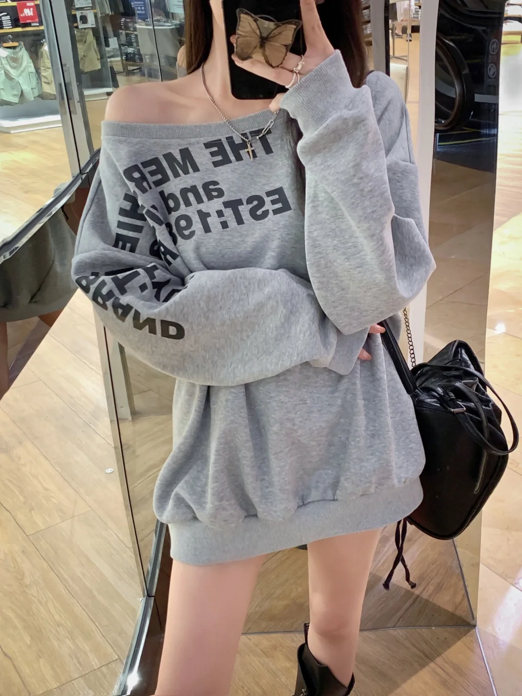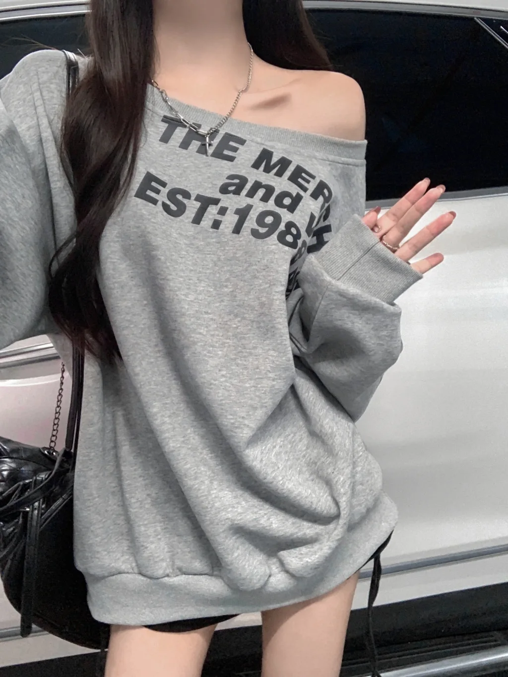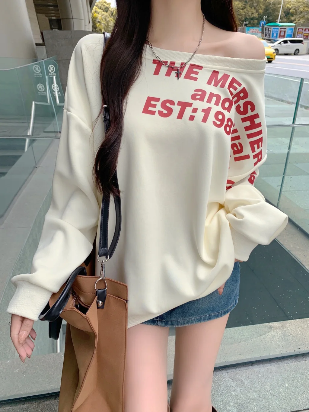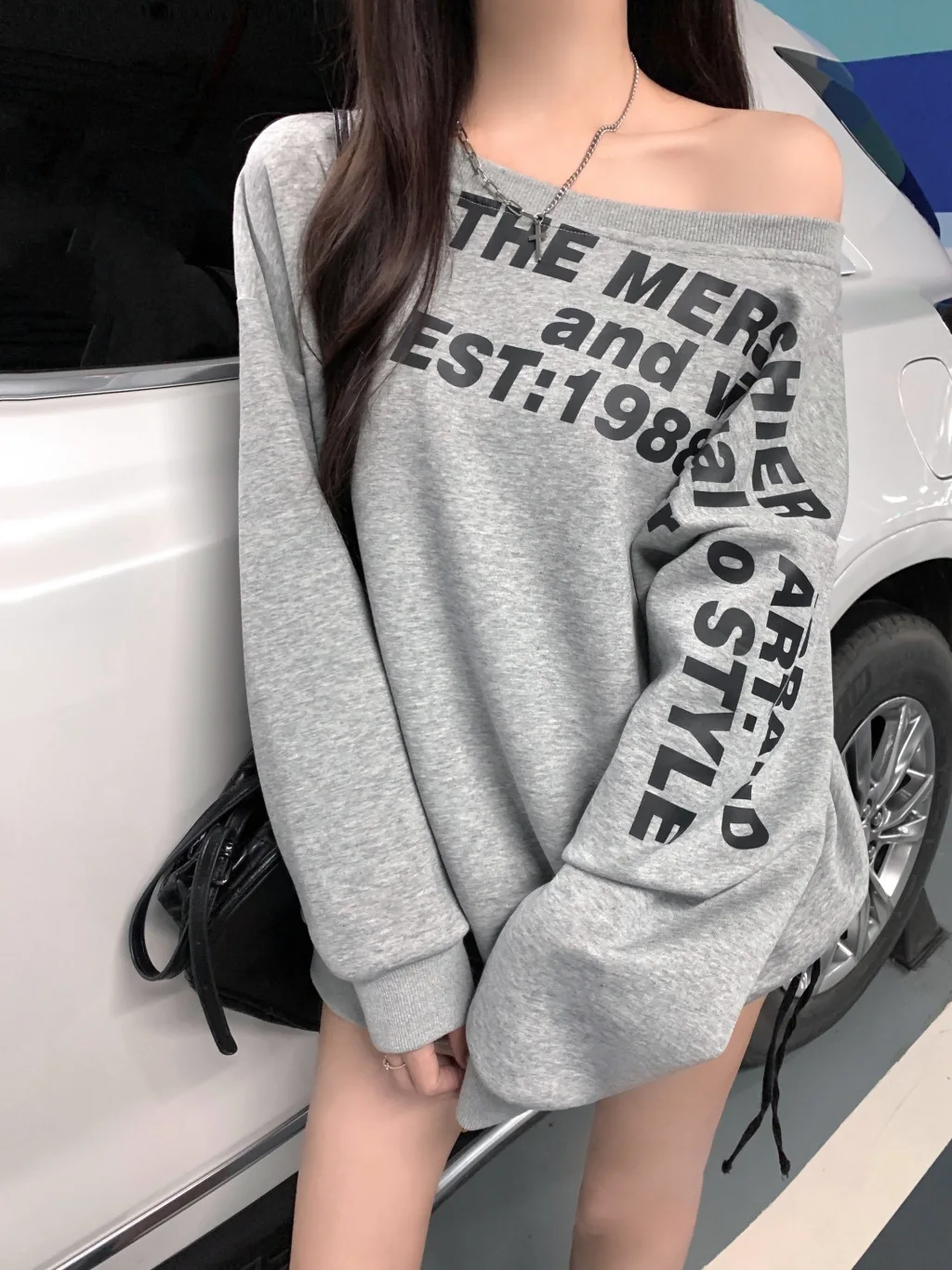 A trendy oversized women's streetwear t-shirt featuring letter print and unique skew collar off-shoulder design. Made from comfortable polyester with medium stretch and loose fit, perfect for Korean fashion-inspired casual autumn/winter looks.