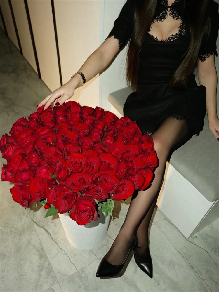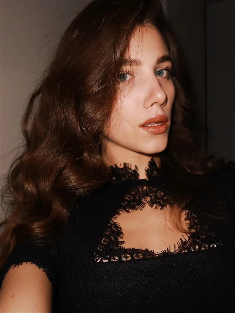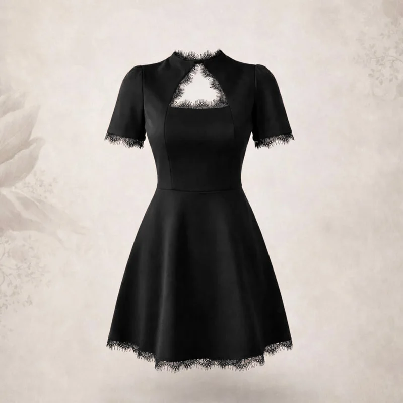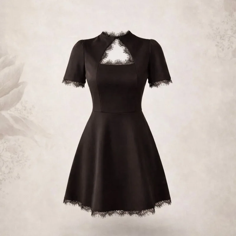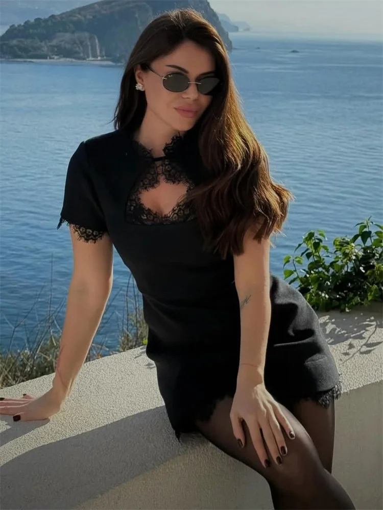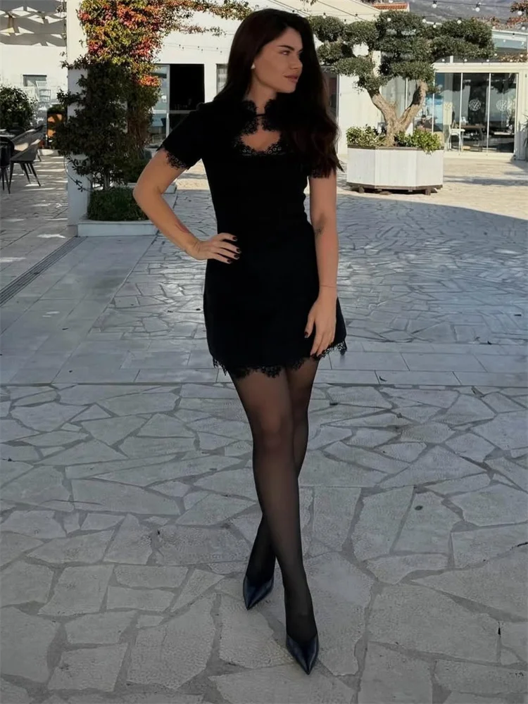 Product Description (English): Black Lace Hollow Out Mini Dress - A women's sexy party dress featuring O-neck, half sleeves, lace decoration, patchwork design, high waist, slim-fit A-line silhouette, high-stretch polyester fabric, and printed details perfect for spring/summer casual or party wear.