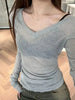 V-neck perspective (sheer) design Long sleeves with loose fit silhouette Thin knit fabric for summer wear Polyester and spandex blend with high stretch Solid color Y2K streetwear style Available in black, dark grey, grey, and white Size range: S to XL
