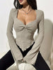 A fashionable women's ribbed knit top featuring a square collar, elegant bell sleeves, and unique knotted hem texture. Made from comfortable polyester-spandex blend with medium stretch, perfect for spring and autumn styling.